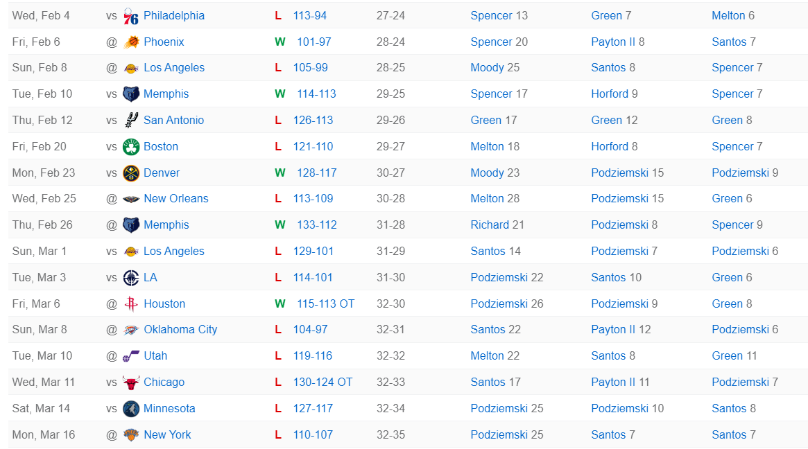 勇士队领先21分被逆转吞下五连败,终场前28秒波杰姆斯基拼下后场篮板,在终场前23秒错失了反超的三分球,终场前16秒桑托斯对沙梅特犯规,随后沙梅特两罚全中拉开到3分,终场前7秒波杰姆斯基抢了一个两分,但随后阿奴诺比两罚全中,终场前1秒桑托斯传球失误。
